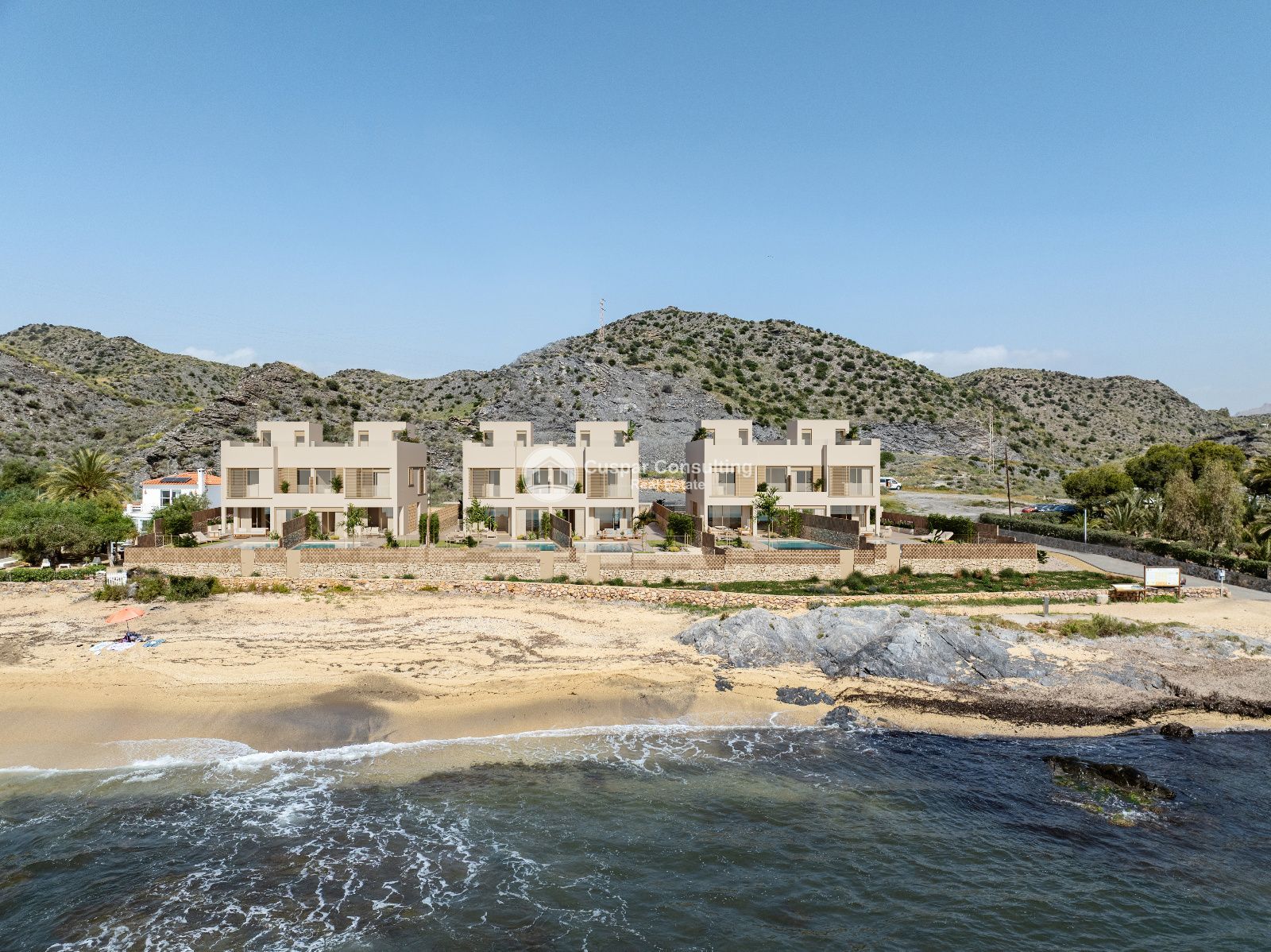 Located on the very first line of the beach, in front of a sandy cove with calm waters, these villas represent the perfect blend of modern architecture, top-quality materials, and Mediterranean harmony.