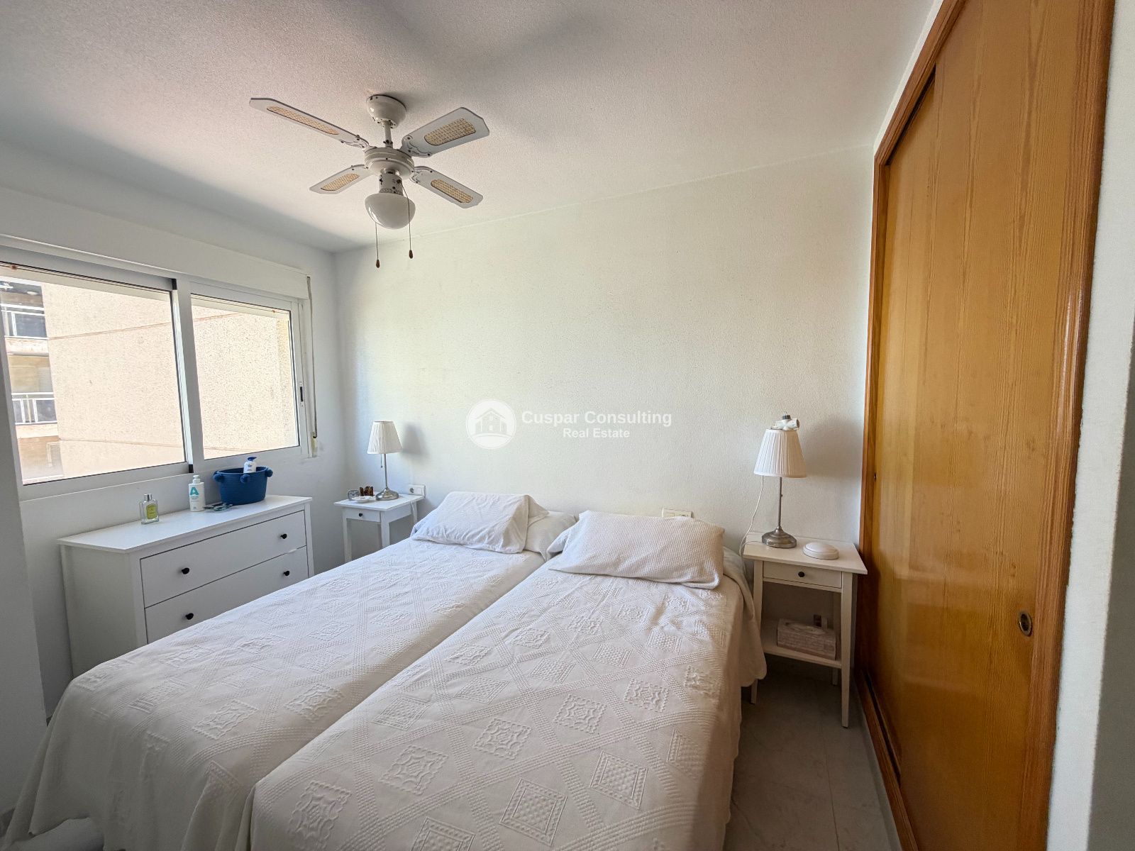 The property has a floor area of 75 m², comprising 2 bedrooms, 1 full bathroom, a bright living room and an electric kitchen. It features ceiling fans and a lift, and is situated in a building constructed in 2002 with a communal swimming pool, perfect for enjoying the Mediterranean climate. It also includes a garage space, a highly sought-after added bonus in the area.