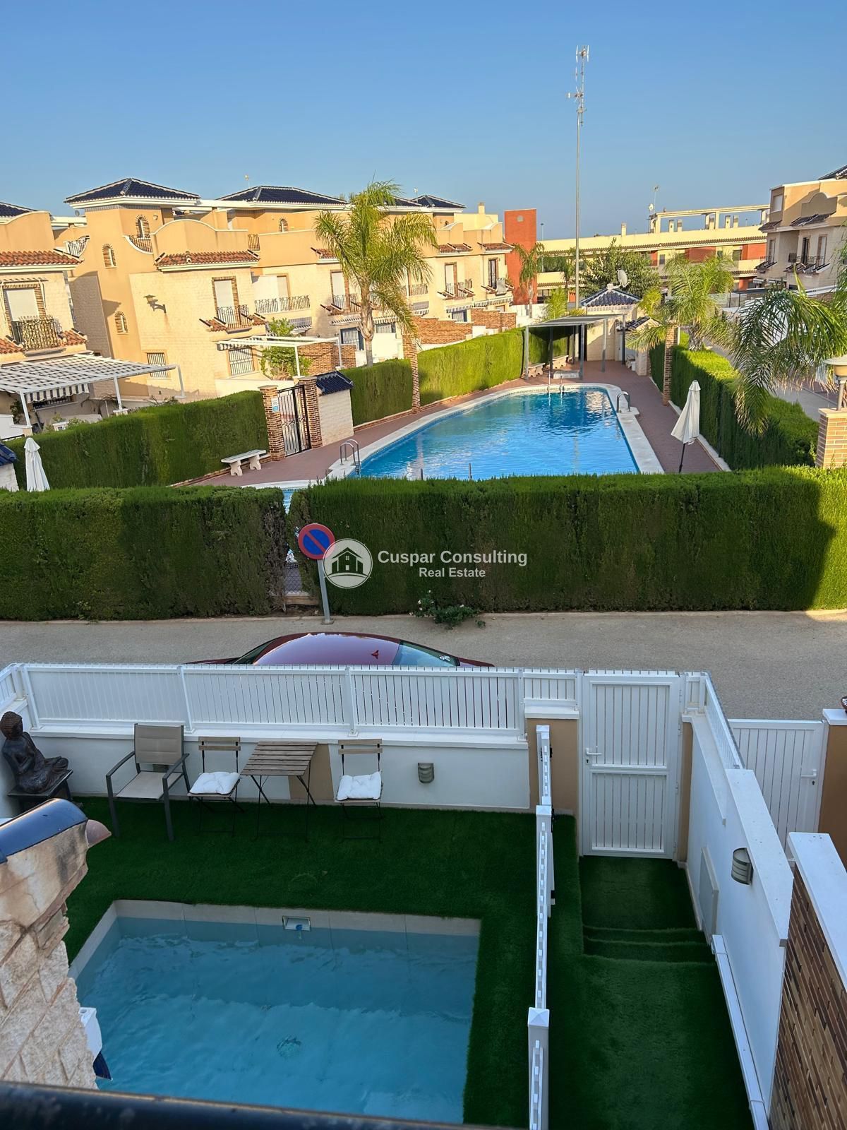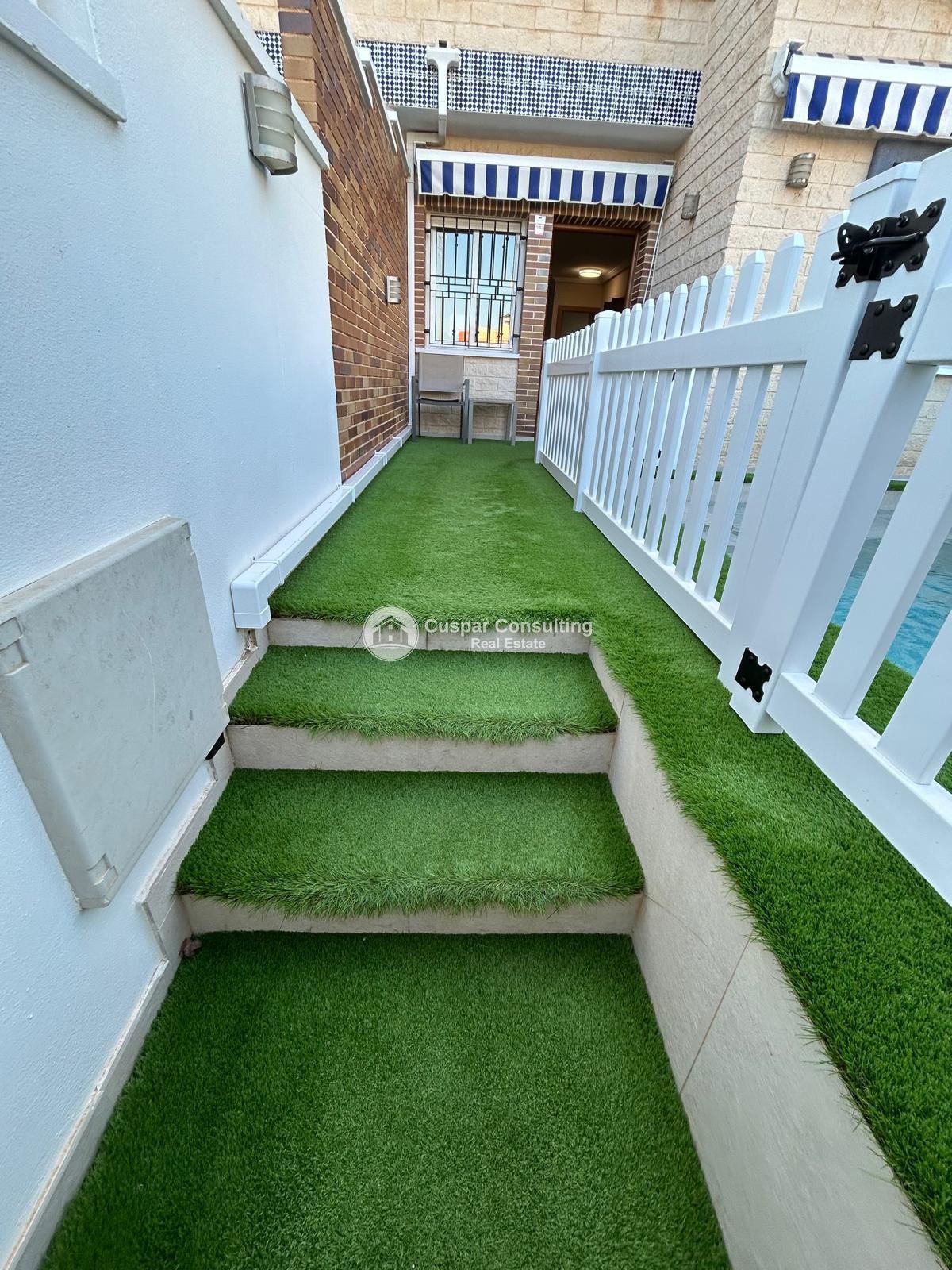 Enjoy an exclusive setting with a private and communal swimming pool, private garden, terrace with sea views and garage. Every corner has been designed for comfort: it has air conditioning, fitted wardrobes, security grilles, mosquito nets and low-maintenance artificial grass.