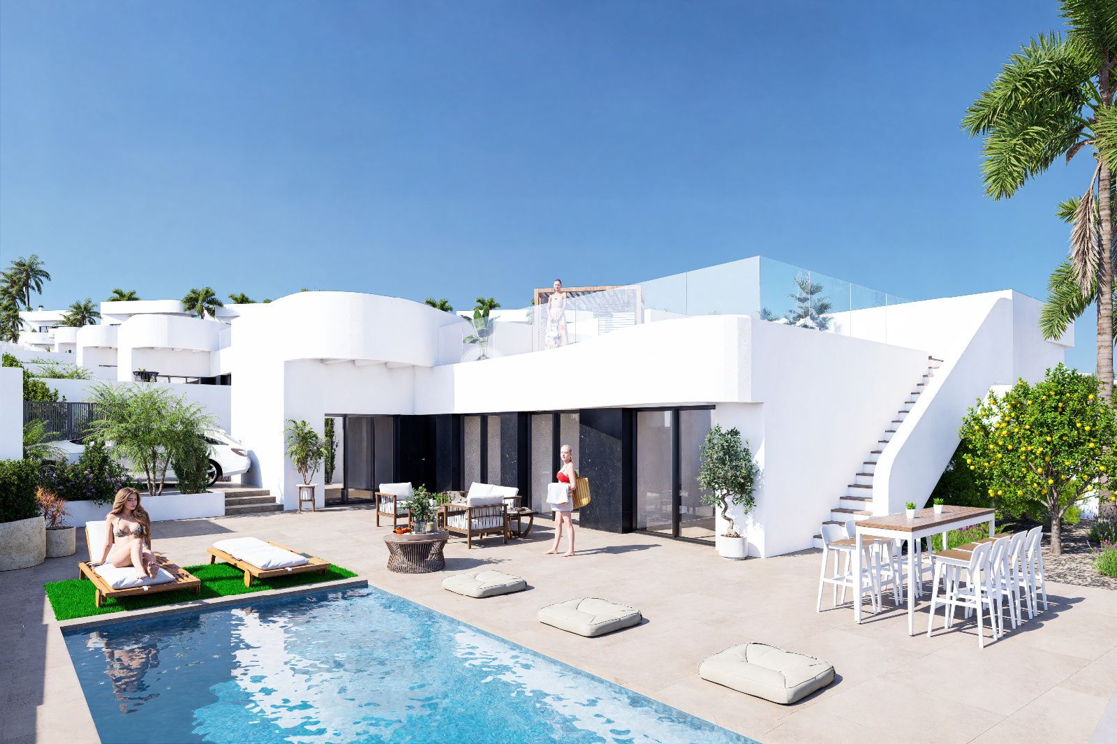Each villa has a private swimming pool (7×3 m or 6×3 m depending on the type), parking included, laundry room and dressing room in the master bedroom. Option of basement and basic home automation system, with control of lighting, blinds, air conditioning and technical alarms, providing comfort, security and efficiency.