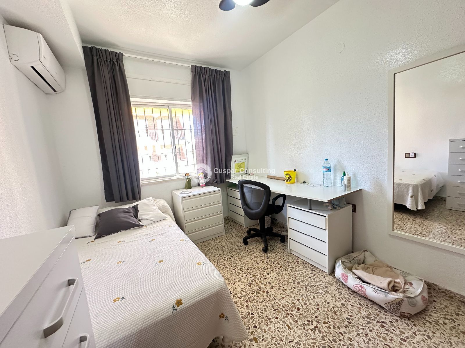 La propiedad cuenta con 120 m² construidos distribuidos en 4 dormitorios y 2 baños, ideal para familias o para quienes buscan espacio y comodidad cerca del mar. Dispone además de terraza, balcón y un amplio solárium perfecto para disfrutar del buen clima durante todo el año. La vivienda se encuentra en buen estado y está equipada con aire acondicionado, trastero, jardín y placas solares, aportando eficiencia energética y confort.