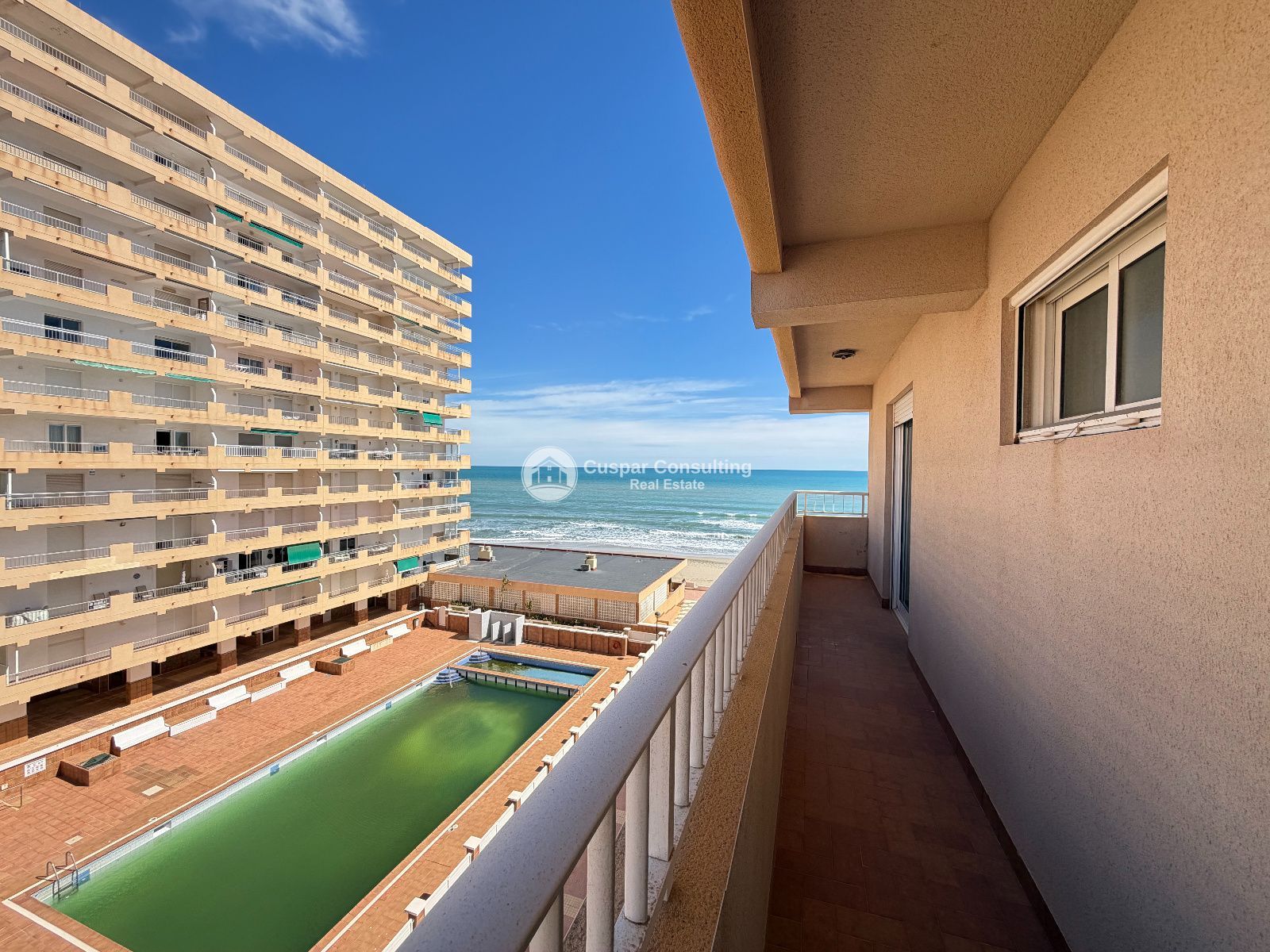 L'appartamento dispone di 2 camere da letto, 1 bagno, un luminoso soggiorno e una comoda distribuzione che permette di sfruttare al massimo lo spazio. Situato al quinto piano con ascensore, offre maggiore privacy e ventilazione naturale. Il complesso residenziale dispone di 2 piscine comuni e di un parcheggio comune, garantendo comodità e valore aggiunto, specialmente durante i mesi estivi.