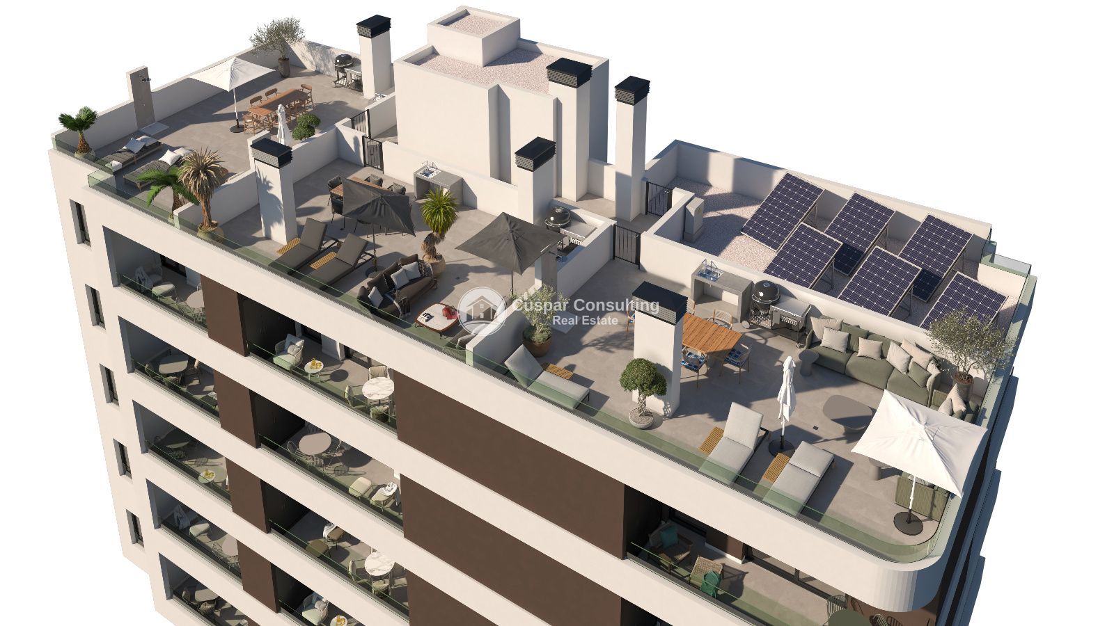 Gli attici si distinguono in particolare per l'ampio solarium privato, ideale per creare un autentico spazio esterno personalizzato. È possibile aggiungere barbecue, doccia, lavello, spazio per un frigorifero compatto e arredi da esterno di alta gamma, perfetti per godersi il clima privilegiato durante tutto l'anno.
